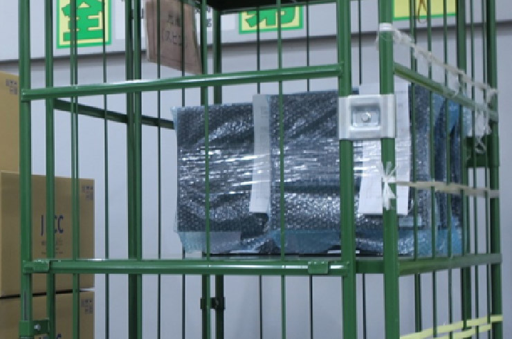 撤去した液晶(合計250台)をカゴ車に載せ、破損防止のために緩衝材で補強しエレベーターから降ろしました。 トラック搬送前の準備として、荷崩れ防止用ベルトを巻いて荷台へ厳重に固定しました。